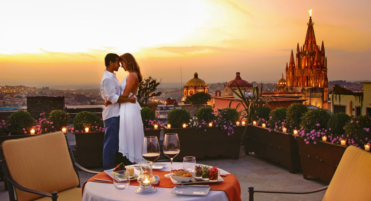 No hay mejor manera de terminar el día que con una copa de vino en una terraza con vista a la majestuosa Parroquia de San Miguel Arcángel iluminada.
